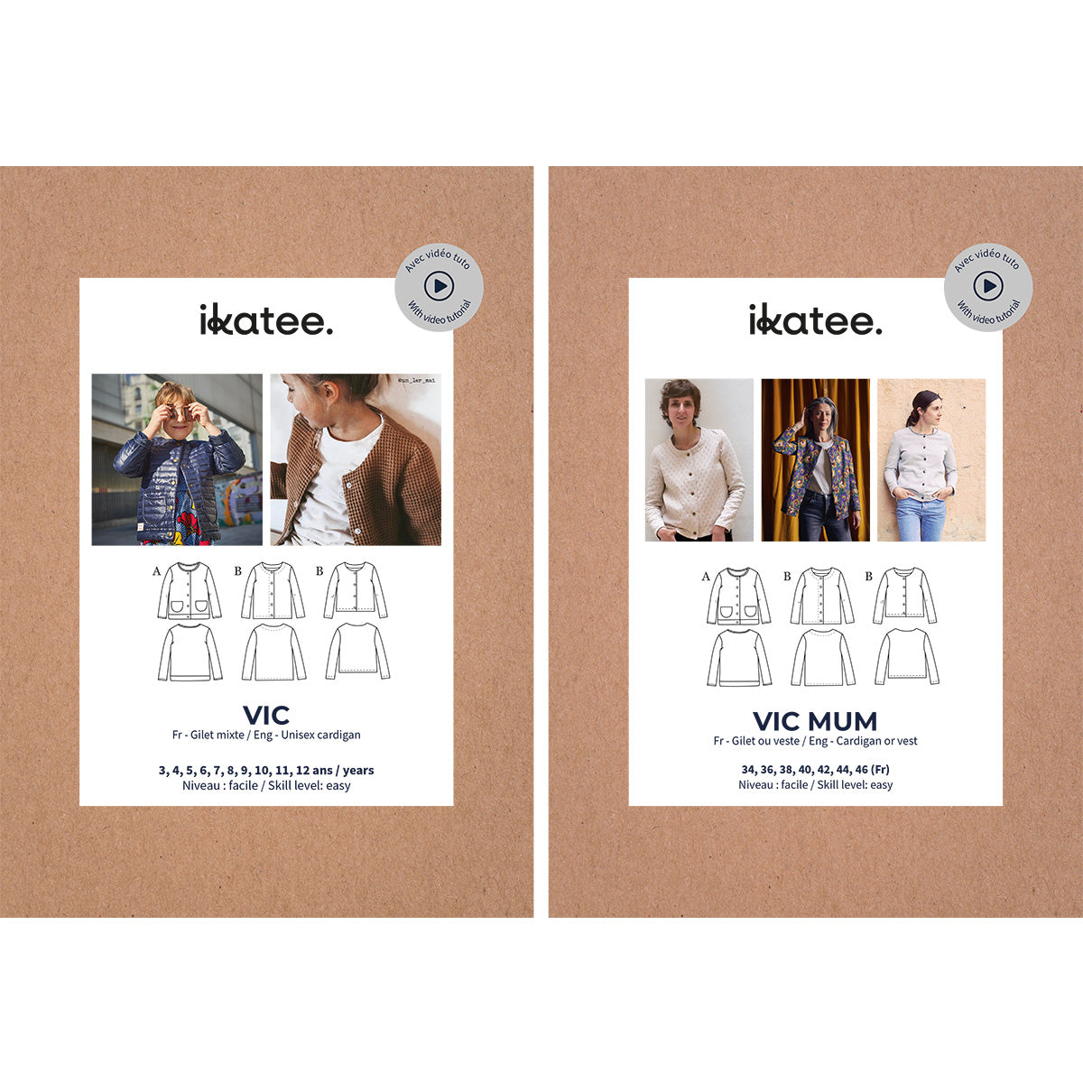 {"id":9023460802905,"title":"Duo for woman and kid VIC cardigan\/vest - paper sewing pattern","handle":"vic-duo-cardigan-girl-mum-paper-sewing-pattern","description":"\u003ch2\u003e2 paper sewing pattern duos:\u003c\/h2\u003e\n\u003ch2 data-mce-fragment=\"1\"\u003eWomen from 34 to 46 and children from 3 to 12 years.\u003c\/h2\u003e\n\u003cp\u003e\u003cstrong\u003eComfortable cardigan.\u003c\/strong\u003e\u003c\/p\u003e\n\u003cp\u003eStraight cut. 2 versions: A or B. 2 options: hemmed bottom or added band. 2 lengths: mid-hips or mid-buttocks. 2 neckline options: with bias tape or facing. Front button closure. Optional round patch pockets. Sleeve bottoms with hem or bias tape. 2 timeless versions.\u003c\/p\u003e\n\u003cp class=\"p1\"\u003e\u003cmeta charset=\"utf-8\"\u003eThe sewing pattern is also available in PDF to print at home in A4 or US letter or to be printed in a specialized copy shop in A0 (\u003ca href=\"%20https:\/\/ikatee.com\/products\/duo-vic-cardigan-kids-mum-pdf-sewing-patterns\"\u003esee the VIC duo PDF patterns\u003c\/a\u003e)\u003c\/p\u003e\n\u003cdiv\u003e \u003c\/div\u003e\n\u003ch2\u003e\u003cstrong\u003eSewing level: \u003cspan style=\"color: #808080;\"\u003eeasy\u003c\/span\u003e\u003c\/strong\u003e\u003c\/h2\u003e\n\u003cp\u003e\u003cstrong\u003eWhat you will learn with this pattern:\u003c\/strong\u003e how to make a button placket integrated into the body or attach a facing, apply bias tape to the neckline and sleeve bottoms for the bias option, and sew optional pockets.\u003c\/p\u003e\n\u003cp\u003e\u003cspan style=\"color: rgb(43, 0, 255);\"\u003e\u003ca href=\"https:\/\/ikatee.com\/pages\/vic-vega-sewing-patterns-video-tutorial\" style=\"color: rgb(43, 0, 255);\"\u003eA video covering the complete assembly of the garment is available for free access\u003c\/a\u003e\u003c\/span\u003e on the website.\u003c\/p\u003e\n\u003cp\u003e\u003ca href=\"https:\/\/ikatee.fr\/pages\/tutoriel-en-video-des-patrons-de-couture-vic-et-vega\"\u003e\u003cimg src=\"https:\/\/cdn.shopify.com\/s\/files\/1\/1051\/5902\/files\/2_42b47d41-4c89-4822-8c8a-bcbf1e287feb_480x480.png?v=1589553538\" alt=\"\"\u003e\u003c\/a\u003e\u003c\/p\u003e\n\u003ch2\u003e\n\u003cstrong\u003eSize range for women\u003c\/strong\u003e : \u003cspan data-mce-fragment=\"1\"\u003e34, 36, 38, 40, 42, 44, 46 (French size)\u003c\/span\u003e\n\u003c\/h2\u003e\n\u003ch2\u003e\n\u003cstrong\u003eAge range for kids \u003c\/strong\u003e: 3, 4, 5, 6, 7, 8, 9, 10, 11, 12 years\u003c\/h2\u003e\n\u003cp\u003e \u003c\/p\u003e\n\u003ch2\u003eWomen's Size Guide:\u003c\/h2\u003e\n\u003cp\u003e\u003cmeta charset=\"utf-8\"\u003eThis model is offered in sizes 34 to 46 for an average height of 165 cm. It is recommended to first take your measurements and choose the most suitable pattern size. If you are hesitating between two sizes, it is better to choose the larger of the two.\u003c\/p\u003e\n\u003ctable style=\"width: 100.039%; height: 133.602px;\"\u003e\n\u003ctbody\u003e\n\u003ctr style=\"height: 19.6007px;\"\u003e\n\u003ctd style=\"width: 36.4204%; height: 19.6007px;\"\u003e\u003cstrong\u003eSize\u003c\/strong\u003e\u003c\/td\u003e\n\u003ctd style=\"width: 8.01015%; height: 19.6007px;\"\u003e\u003cstrong\u003e34\u003c\/strong\u003e\u003c\/td\u003e\n\u003ctd style=\"width: 8.01015%; height: 19.6007px;\"\u003e\u003cstrong\u003e36\u003c\/strong\u003e\u003c\/td\u003e\n\u003ctd style=\"width: 8.01015%; height: 19.6007px;\"\u003e\u003cstrong\u003e38\u003c\/strong\u003e\u003c\/td\u003e\n\u003ctd style=\"width: 8.01015%; height: 19.6007px;\"\u003e\u003cstrong\u003e40\u003c\/strong\u003e\u003c\/td\u003e\n\u003ctd style=\"width: 8.01015%; height: 19.6007px;\"\u003e\u003cstrong\u003e42\u003c\/strong\u003e\u003c\/td\u003e\n\u003ctd style=\"width: 8.01015%; height: 19.6007px;\"\u003e\u003cstrong\u003e44\u003c\/strong\u003e\u003c\/td\u003e\n\u003ctd style=\"width: 8.01647%; height: 19.6007px;\"\u003e\u003cstrong\u003e46\u003c\/strong\u003e\u003c\/td\u003e\n\u003c\/tr\u003e\n\u003ctr style=\"height: 19.6007px;\"\u003e\n\u003ctd style=\"width: 36.4204%; height: 19.6007px;\"\u003e\u003cstrong\u003eheight (cm)\u003c\/strong\u003e\u003c\/td\u003e\n\u003ctd style=\"width: 8.01015%; height: 19.6007px;\"\u003e\u003cstrong\u003e165\u003c\/strong\u003e\u003c\/td\u003e\n\u003ctd style=\"width: 8.01015%; height: 19.6007px;\"\u003e\u003cstrong\u003e165\u003c\/strong\u003e\u003c\/td\u003e\n\u003ctd style=\"width: 8.01015%; height: 19.6007px;\"\u003e\u003cstrong\u003e165\u003c\/strong\u003e\u003c\/td\u003e\n\u003ctd style=\"width: 8.01015%; height: 19.6007px;\"\u003e\u003cstrong\u003e165\u003c\/strong\u003e\u003c\/td\u003e\n\u003ctd style=\"width: 8.01015%; height: 19.6007px;\"\u003e\u003cstrong\u003e165\u003c\/strong\u003e\u003c\/td\u003e\n\u003ctd style=\"width: 8.01015%; height: 19.6007px;\"\u003e\u003cstrong\u003e165\u003c\/strong\u003e\u003c\/td\u003e\n\u003ctd style=\"width: 8.01647%; height: 19.6007px;\"\u003e\u003cstrong\u003e165\u003c\/strong\u003e\u003c\/td\u003e\n\u003c\/tr\u003e\n\u003ctr style=\"height: 19.6007px;\"\u003e\n\u003ctd style=\"width: 36.4204%; height: 19.6007px;\"\u003e\n\u003cmeta charset=\"utf-8\"\u003ebust measurement\u003c\/td\u003e\n\u003ctd style=\"width: 8.01015%; height: 19.6007px;\"\u003e80\u003c\/td\u003e\n\u003ctd style=\"width: 8.01015%; height: 19.6007px;\"\u003e84\u003c\/td\u003e\n\u003ctd style=\"width: 8.01015%; height: 19.6007px;\"\u003e88\u003c\/td\u003e\n\u003ctd style=\"width: 8.01015%; height: 19.6007px;\"\u003e92\u003c\/td\u003e\n\u003ctd style=\"width: 8.01015%; height: 19.6007px;\"\u003e96\u003c\/td\u003e\n\u003ctd style=\"width: 8.01015%; height: 19.6007px;\"\u003e100\u003c\/td\u003e\n\u003ctd style=\"width: 8.01647%; height: 19.6007px;\"\u003e104\u003c\/td\u003e\n\u003c\/tr\u003e\n\u003ctr style=\"height: 19.6007px;\"\u003e\n\u003ctd style=\"width: 36.4204%; height: 19.6007px;\"\u003ewaist measurement\u003c\/td\u003e\n\u003ctd style=\"width: 8.01015%; height: 19.6007px;\"\u003e62\u003c\/td\u003e\n\u003ctd s