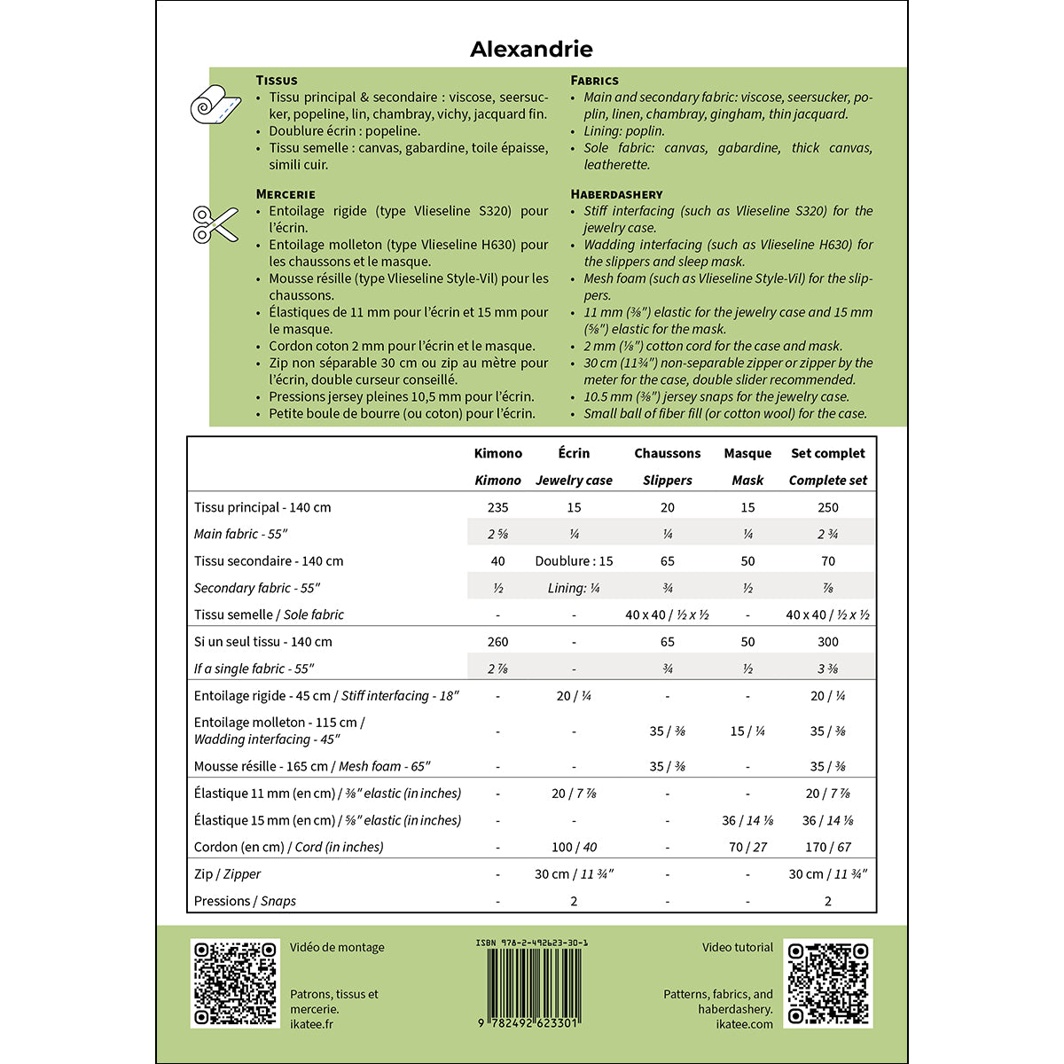 {"id":15356801778038,"title":"ALEXANDRIE - Kimono and bedroom accessories - PDF","handle":"alexandrie-kimono-and-bedroom-accessories-pdf","description":"\u003ch2\u003eBedroom accessories patterns and guidebook for women \u0026amp; men\u003c\/h2\u003e\n\u003cp data-end=\"657\" data-start=\"112\"\u003eAlexandrie is a set of four patterns designed around the bedroom, for women and men: a kimono, slippers, a sleep mask and a jewelry box. The finishes are meticulous (French seams, flat felled seams, trimmed, and piped) for a refined result.\u003c\/p\u003e\n\u003cp class=\"p1\"\u003eThe complete set for bedroom to sew in matching fabrics, for yourself or as a gift.\u003c\/p\u003e\n\u003cp\u003e\u003cstrong\u003eSkill level: \u003c\/strong\u003e\u003cspan color=\"#a5a4a3\"\u003eeasy to advanced\u003c\/span\u003e\u003c\/p\u003e\n\u003cp class=\"p1\"\u003e\u003cb\u003eWhat you will learn with this sewing pattern:\u003c\/b\u003e how to make French seams, to make flat felled seams, to apply bias binding, to apply piping, to sew a zipper, to sew circles.\u003c\/p\u003e\n\u003cp\u003e\u003cstrong\u003eSize range:\u003c\/strong\u003e\u003cspan\u003e \u003c\/span\u003e\u003c\/p\u003e\n\u003cul\u003e\n\u003cli\u003eKimono S\/M (FR 32-42, UK 4-14, US 0-10) \u0026amp; L\/XL (FR 44-52, UK 16-24, US 12-20)(for men, refer to the finished product measurement chart)\u003cspan style=\"font-family: -apple-system, BlinkMacSystemFont, 'San Francisco', 'Segoe UI', Roboto, 'Helvetica Neue', sans-serif; font-size: 0.875rem;\"\u003e.\u003c\/span\u003e\n\u003c\/li\u003e\n\u003cli\u003eSlippers 36\/37, 38\/39, 40\/41, 42\/43, 44\/45.\u003c\/li\u003e\n\u003cli\u003eOne size sleep mask and jewelry case.\u003c\/li\u003e\n\u003c\/ul\u003e\n\u003cp\u003e\u003cspan\u003e\u003ca href=\"https:\/\/ikatee.com\/pages\/size-guide\"\u003eSee the size guide.\u003c\/a\u003e\u003c\/span\u003e\u003c\/p\u003e\n\u003cp\u003e\u003cstrong\u003eFabrics:\u003c\/strong\u003e\u003c\/p\u003e\n\u003cul\u003e\n\u003cli\u003e\n\u003cp class=\"p1\"\u003eMain and secondary fabric: viscose, seersucker, poplin, linen, chambray, gingham, thin jacquard.\u003c\/p\u003e\n\u003c\/li\u003e\n\u003cli\u003e\n\u003cp class=\"p1\"\u003eLining: poplin.\u003c\/p\u003e\n\u003c\/li\u003e\n\u003cli\u003e\n\u003cp class=\"p1\"\u003eSole fabric: canvas, gabardine, thick canvas, leatherette\u003c\/p\u003e\n\u003c\/li\u003e\n\u003c\/ul\u003e\n\u003cp\u003e\u003cstrong\u003eSee supplies infos at footer tab \"Supplies\".\u003c\/strong\u003e\u003c\/p\u003e\n\u003ch3\u003e\u003cstrong\u003ePDF pattern: \u003c\/strong\u003e\u003c\/h3\u003e\n\u003cdiv\u003eSee all information on what you will receive in the \u003cstrong\u003efooter tab \"delivery\".\u003c\/strong\u003e\n\u003c\/div\u003e","published_at":"2025-10-01T16:27:58+02:00","created_at":"2025-09-25T10:07:20+02:00","vendor":"ikatee","type":"PDF Sewing Pattern","tags":["accessories","BF20","Categories_Underwear","Collection_Osaka","Ikatee Home","PDF excl duo","PDF Pattern","projector pattern","Sewing level_Easy","Sewing level_Intermediate"],"price":1300,"price_min":1300,"price_max":1300,"available":true,"price_varies":false,"compare_at_price":null,"compare_at_price_min":0,"compare_at_price_max":0,"compare_at_price_varies":false,"variants":[{"id":56343121690998,"title":"Default Title","option1":"Default Title","option2":null,"option3":null,"sku":"02.ALEX-IKPER106","requires_shipping":false,"taxable":true,"featured_image":null,"available":true,"name":"ALEXANDRIE - Kimono and bedroom accessories - PDF","public_title":null,"options":["Default Title"],"price":1300,"weight":275,"compare_at_price":null,"inventory_quantity":-280,"inventory_management":null,"inventory_policy":"continue","barcode":null,"requires_selling_plan":false,"selling_plan_allocations":[],"quantity_rule":{"min":1,"max":null,"increment":1}}],"images":["\/\/ikatee.com\/cdn\/shop\/files\/4M9A3150.jpg?v=1758788381","\/\/ikatee.com\/cdn\/shop\/files\/DessinALEXANDRIEcarre.jpg?v=1758788381","\/\/ikatee.com\/cdn\/shop\/files\/4M9A2926.jpg?v=1759136571","\/\/ikatee.com\/cdn\/shop\/files\/4M9A2990.jpg?v=1759136571","\/\/ikatee.com\/cdn\/shop\/files\/P1480802_0d4dff01-cfb0-49b1-ba0a-89d036ff4142.jpg?v=1759249022","\/\/ikatee.com\/cdn\/shop\/files\/4M9A2946.jpg?v=1759249022","\/\/ikatee.com\/cdn\/shop\/files\/4M9A3162.jpg?v=1759249022","\/\/ikatee.com\/cdn\/shop\/files\/4M9A3036.jpg?v=1759249022","\/\/ikatee.com\/cdn\/shop\/files\/4M9A2893.jpg?v=1759249022","\/\/ikatee.com\/cdn\/shop\/files\/P1480708_9893f5a6-55bc-48bc-ac19-7b5761419752.jpg?v=1759249022","\/\/ikatee.com\/cdn\/shop\/files\/4M9A2940.jpg?v=1759249022","\/\/ikatee.com\/cdn\/shop\/files\/4M9A3117_5a1db946-332d-43d4-b851-9974eac349a7.jpg?v=1759249022","\/\/ikatee.com\/cdn\/shop\/files\/4M9A2945.jpg?v=1759249022","\/\/ikatee.com\/cdn\/shop\/files\/P1480672.jpg?v=1759249022","\/\/ikatee.com\/cdn\/shop\/files\/4M9A3013.jpg?v=1759249022","\/\/ikatee.com\/cdn\/shop\/files\/4M9A3031.jpg?v=1759249022","\/\/ikatee.com\/cdn\/shop\/files\/P1480818_8e1cd44b-017e-49bc-b64f-58769d234c01.jpg?v=1759249022","\/\/ikatee.com\/cdn\/shop\/files\/4M9A3168.jpg?v=1759249022","\/\/ikatee.com\/cdn\/shop\/files\/4M9A3198.jpg?v=1759249022","\/\/ikatee.com\/cdn\/shop\/files\/4M9A3222.jpg?v=1759249022","\/\/ikatee.com\/cdn\/shop\/files\/4M9A3213.jpg?v=1759249022","\/\/ikatee.com\/cdn\/shop\/files\/P1480751.jpg?v=1759249022","\/\/ikatee.com\/cdn\/shop\/files\/TableaumesureskimonoEN.jpg?v=1759249022","\/\/ikatee.com\/cdn\/shop\/files\/ALEXANDRIE17x242_83af15f8-ea69-4f06-8faf-eba749dc81fa.jpg?v=1759249022"],"featured_image":"\/\/ikatee.com\/cdn\/shop\/files\/4M9A3150.jpg?v=1758788381","options":["Title"],"media":[{"alt":null,"id":66835418906998,"position":1,"preview_image":{"aspect_ratio":1.0,"height":1200,"width":1200,"src":"\/\/ikatee.com\/cdn\/shop\/files\/4M9A3150.jpg?v=1758788381"},"aspect_ratio":1.0,"height":1200,"media_type":"image","src":"\/\/ikatee.com\/cdn\/shop\/files\/4M9A3150.jpg?v=1758788381","width":1200},{"alt":null,"id":668